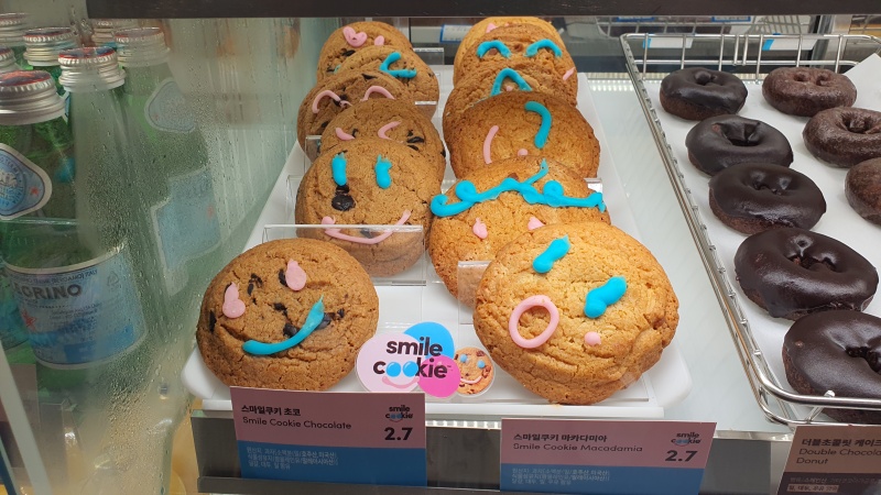 주문을 하고 기다리는 동안 진열장 안에 있는 스마일쿠키 구경을 했습니다.