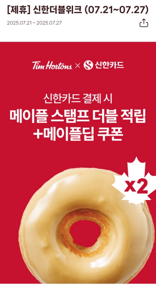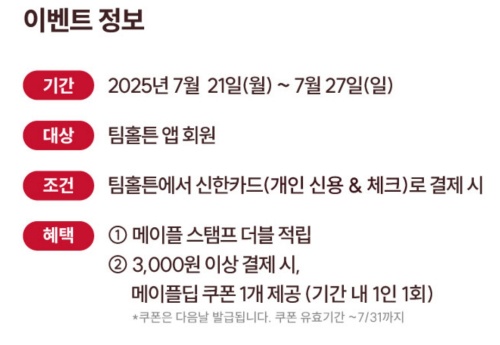 신한카드로 결제하면 메이플 스탬프 2장(더블) 적립,