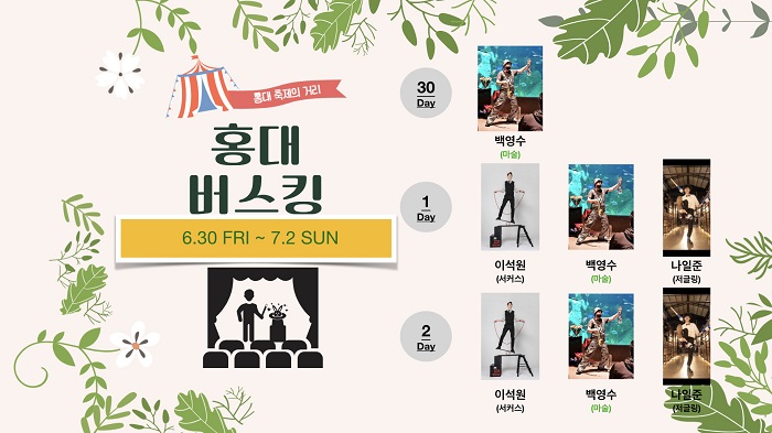 서울 마포구 서교동 홍대 레드로드 축제거리에서 6월 마지막주, 7월 첫째주 주말 열리는 버스킹 일정입니다.