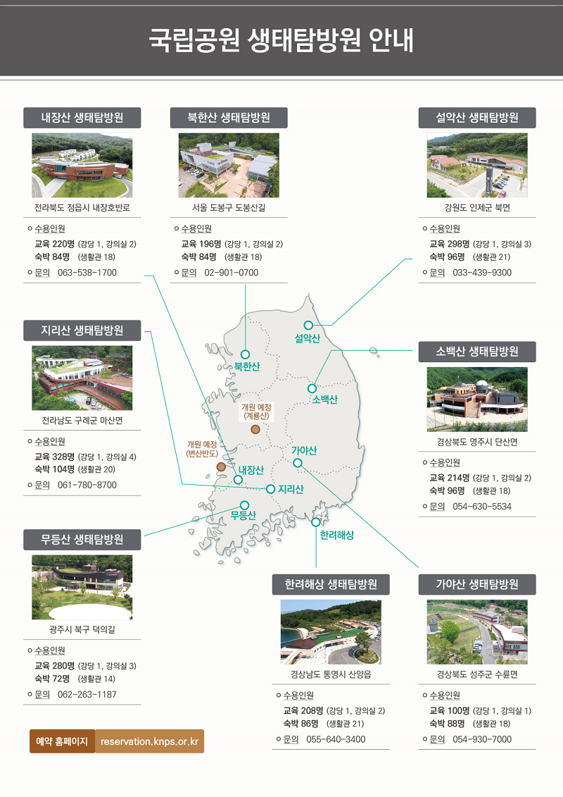 * 국립공원의 우수한 생태·문화 자원을 활용하여 생태관광, 미래세대 환경교육, 치유 프로그램 등을 운영하는 시설로, 2023년 6월 기준 북한산, 지리산, 설악산 등 8개 국립공원에서 운영 중