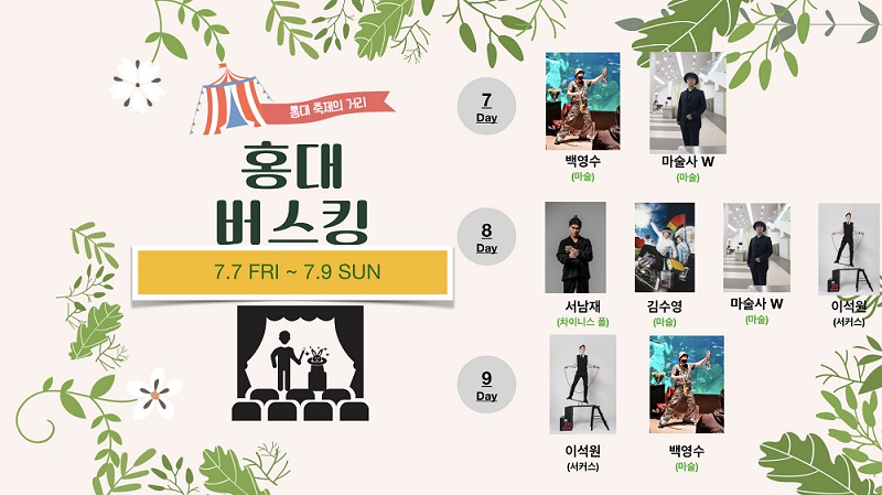 서울 마포구에서는 7월 7일(금) ~ 9일(일) 주말 3일간 홍대 축제거리(레드로드)에서 진행 예정인 거리공연(버스킹) 일정을 아래와 같이 공지했습니다.