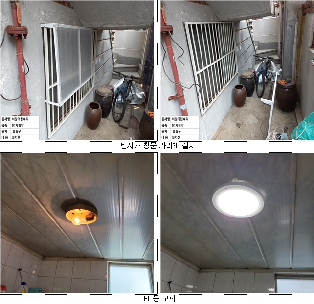 ▶ 기존 : 도배, 장판, 단열, 도어, 방수, 처마, 창호, 창문 가림막, 싱크대, 타일,위생기구(세면대·양변기), 천장 보수, 페인트, 전기작업, 곰팡이 제거