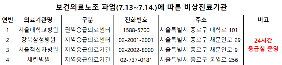 종로구에서는 보건의료노조 파업 기간(2023년 7월 13일 ~ 7월 14일) 중