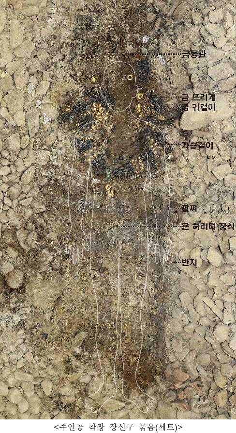 무덤 주인공이 착장한 금동관(1점), 금드리개(1쌍), 금귀걸이(1쌍), 가슴걸이(1식), 금·은 팔찌(12점), 금·은 반지(10점), 은허리띠 장식(1점) 등 장신구 조합,