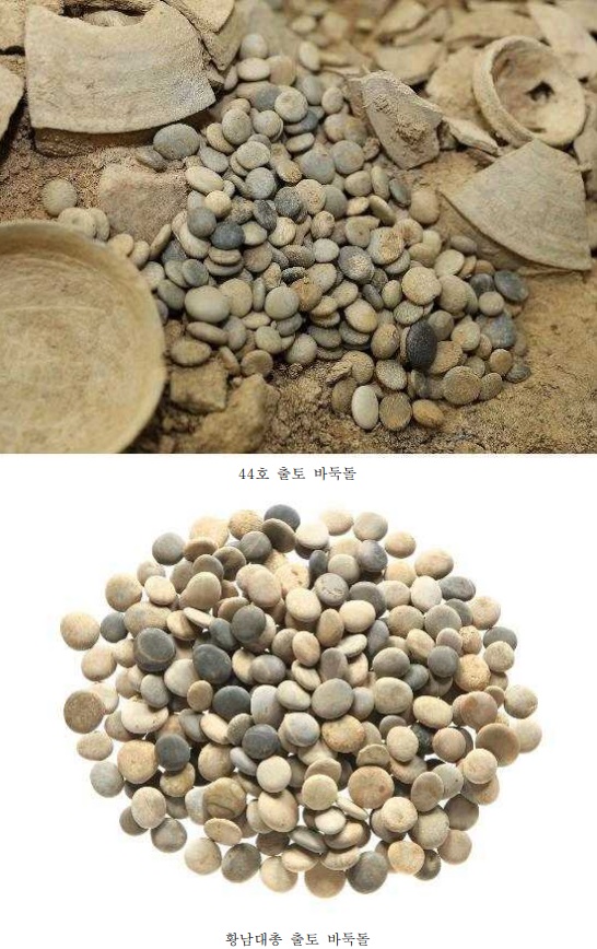 과거에도 신라시대 바둑돌은 황남대총 남분(243점), 천마총(350점), 금관총(200여점), 서봉총(2점) 등 최상위 등급의 돌무지덧널무덤에서만 출토된 바 있습니다.