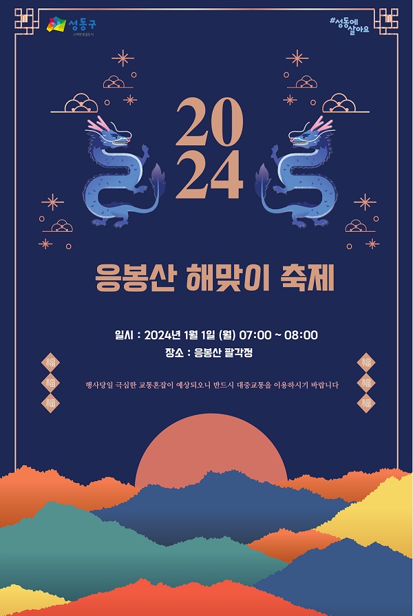 서울 성동구에서는 2024년 갑진년(甲辰年) '청룡(靑龍)의 해'를 맞이하여, 1월 1일 새해 첫 날 응봉산 정상에서 해맞이 축제를 개최합니다.
