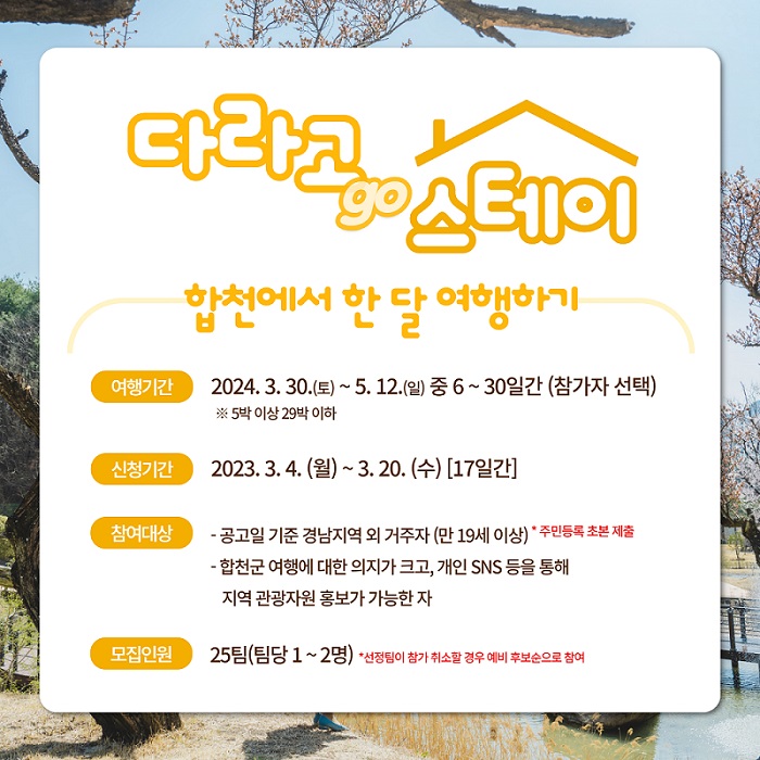경남 합천군(군수 김윤철)은 합천에서 한 달 여행하기 사업인 '다라고(Go!) 스테이' 참가자를 2024년 3월 4일부터 3월 20일까지 모집한다고 3월 4일 밝혔습니다.