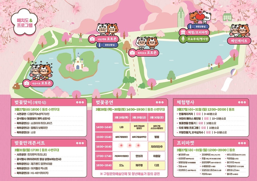 3월 28일부터 30일까지, 14시부터 18시 40분까지는 송파구립합창단, 송파구립실버악단 등 구립문화예술단체 공연, 청년버스킹, 어쿠스틱 팝.재즈 공연 등 다양한 분야(장르)의 공연이 석촌호수 동호 수변무대에서 펼쳐집니다.