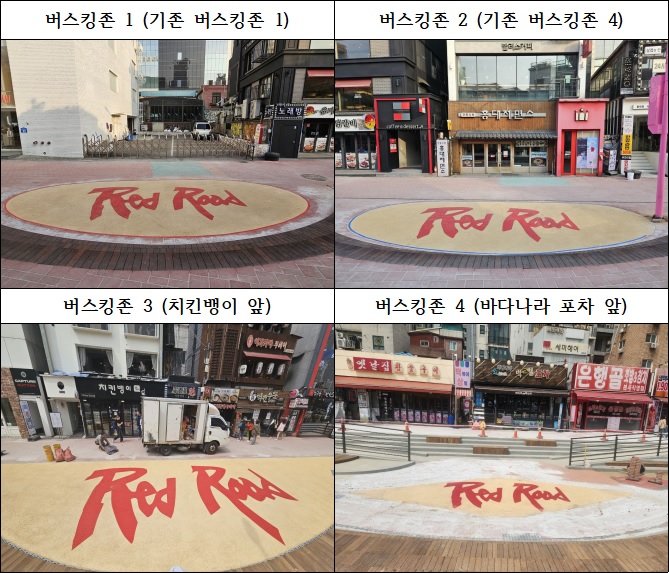 버스킹존1, 버스킹존2(기존4), 버스킹존3(치킨뱅이 앞), 버스킹존4(바다나라포차 앞)