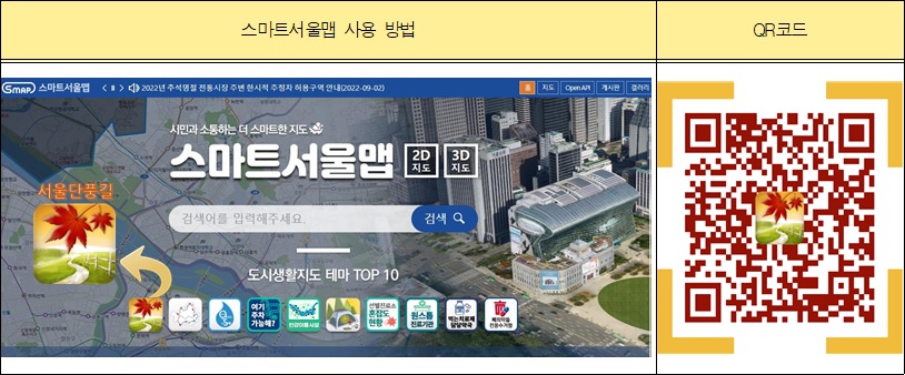 단풍길 정보는 서울시 공식 누리집(https://www.seoul.go.kr/story/autumn)과 스마트서울맵(https://map.seoul.go.kr/)에서 검색고 확인할 수 있습니다.