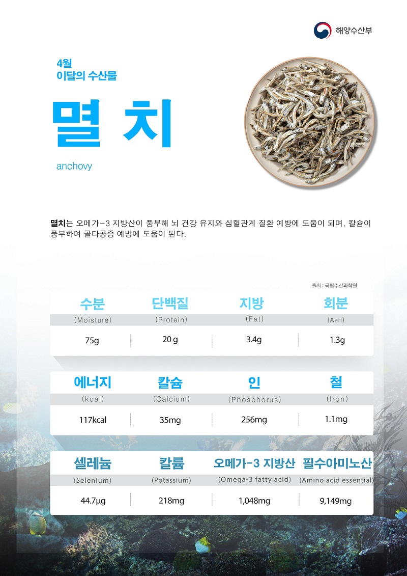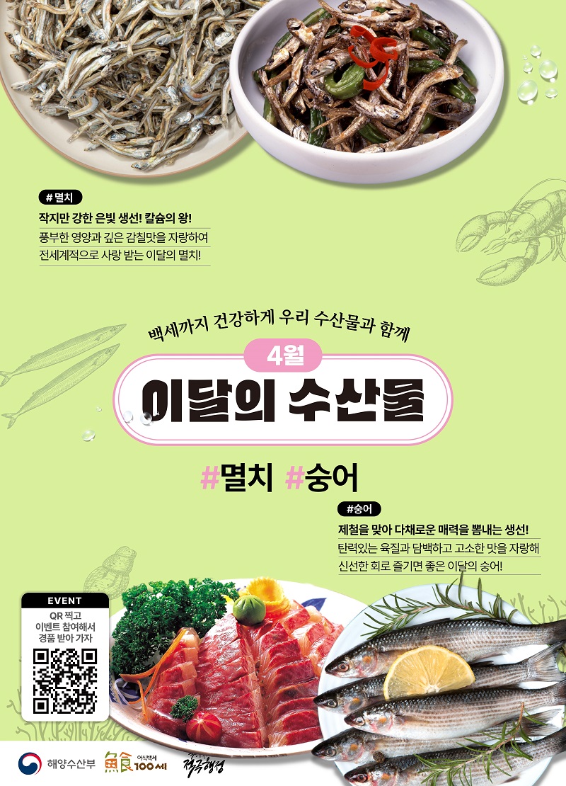 해양수산부(장관 강도형)는 2025년 4월 '이달의 수산물'로 멸치, 숭어를 선정하였습니다.