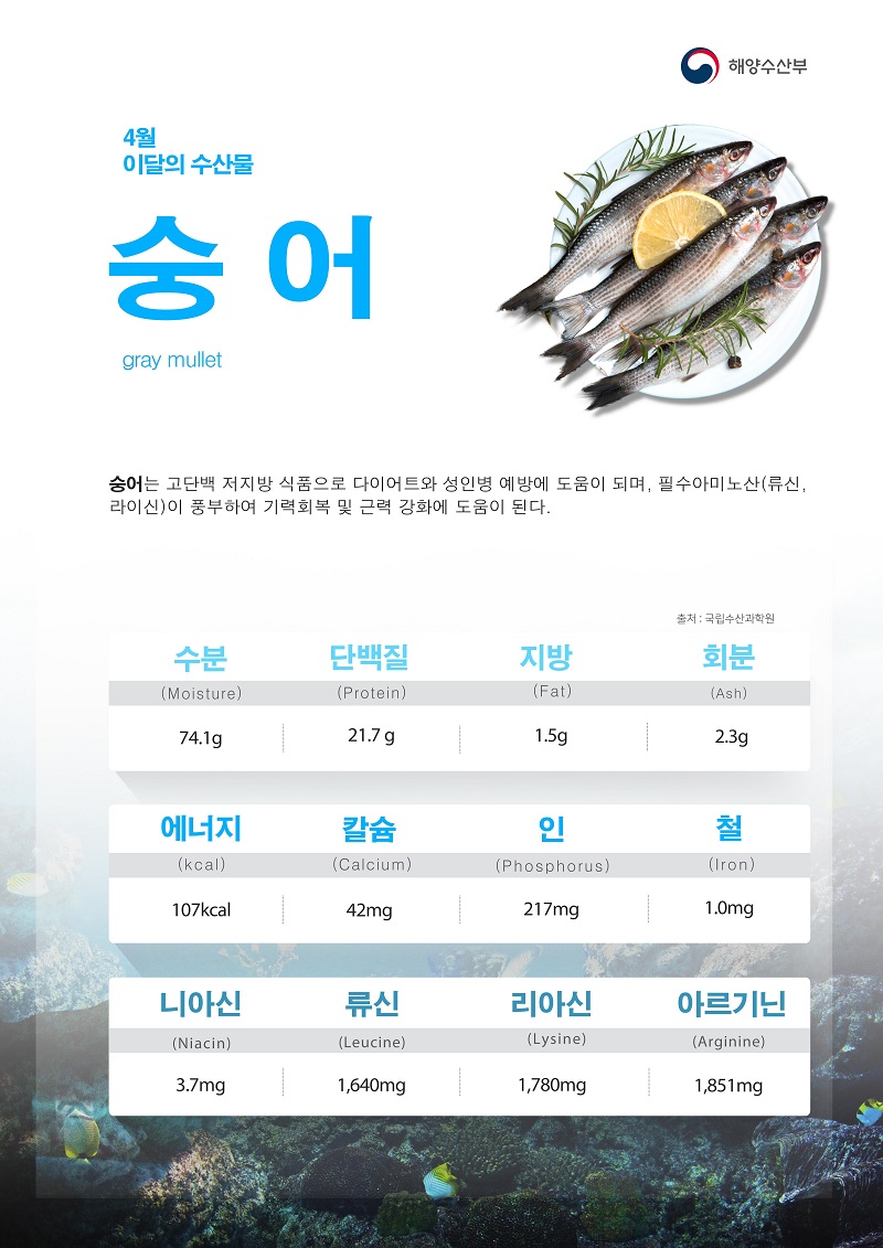 이달의 수산물 멸치와 숭어를 비롯한 수산물 관련 정보는 한국수산회 공식 블로그인 어식백세(http://blog.naver.com/korfish01)에서 확인할 수 있습니다.