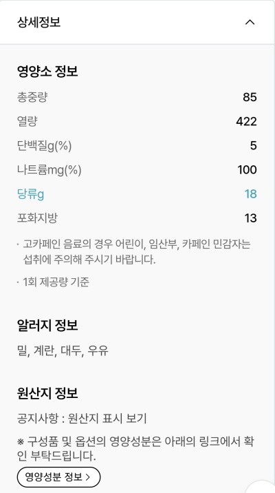 열량은 422킬로칼로리(kcal)입니다.