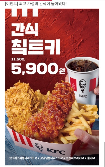 핫크리스피 통다리 1조각 + 갓양념 통다리 1조각 + 프렌치프라이(감자튀김) + 콜라.