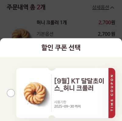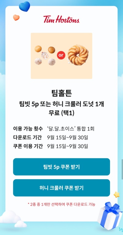 이번에는 '팀빗 5개'와 '허니 크룰러 도넛 1개' 중 하나를 선택하는 조건.