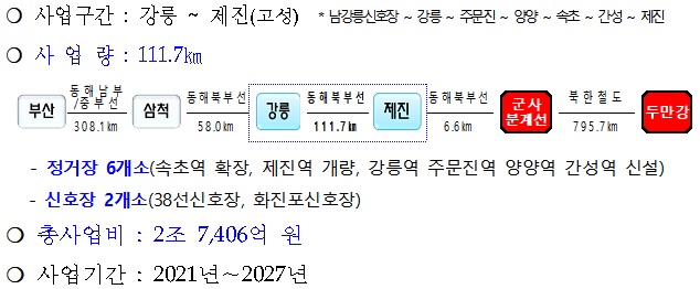 기본계획 고시내용에는 남강릉신호장에서 제진역에 이르는 111.7km(킬로미터)의 노선계획과 정거장 6개소(속초역 확장, 제진역 개량, 강릉역․주문진역․양양역․간성역 신설)와 신호장 2개소(38선․화진포)가 반영되었으며 총사업비 2조 7,406억 원을 들여 춘천~속초간 철도와 함께 2027년까지 건설한다는 계획이 담겨있습니다.
