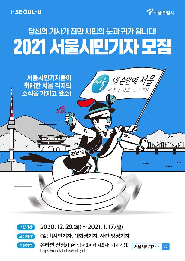 모집기간은 2020년 12월 29일(화)부터 2021년 1월 17일(일)까지 20일간으로, 서울시민 또는 서울생활권자(서울 소재 직장인.학생)이면 누구나 시민기자 활동을 신청할 수 있습니다.