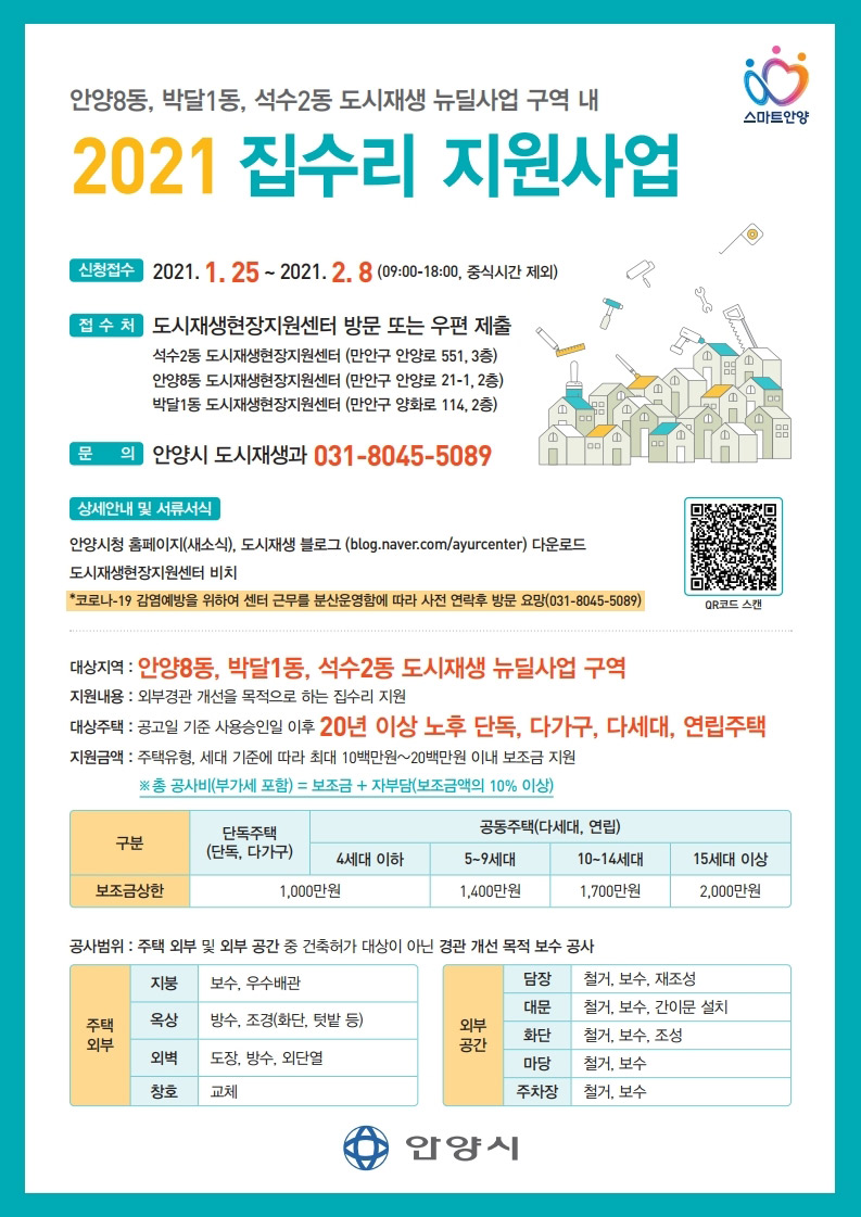 안양시는 2021년 새해에도 도시재생 뉴딜사업 지역 내 노후주택 개선을 지원한다고 12월 29일 밝혔습니다.