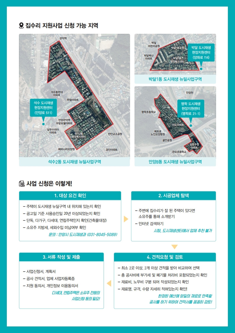 대상은 안양8동, 박달1동, 석수2동 등 3개 지역의 도시재생 뉴딜사업 구역 내 소재한 20년 이상 단독.다가구.다세대.연립주택입니다.