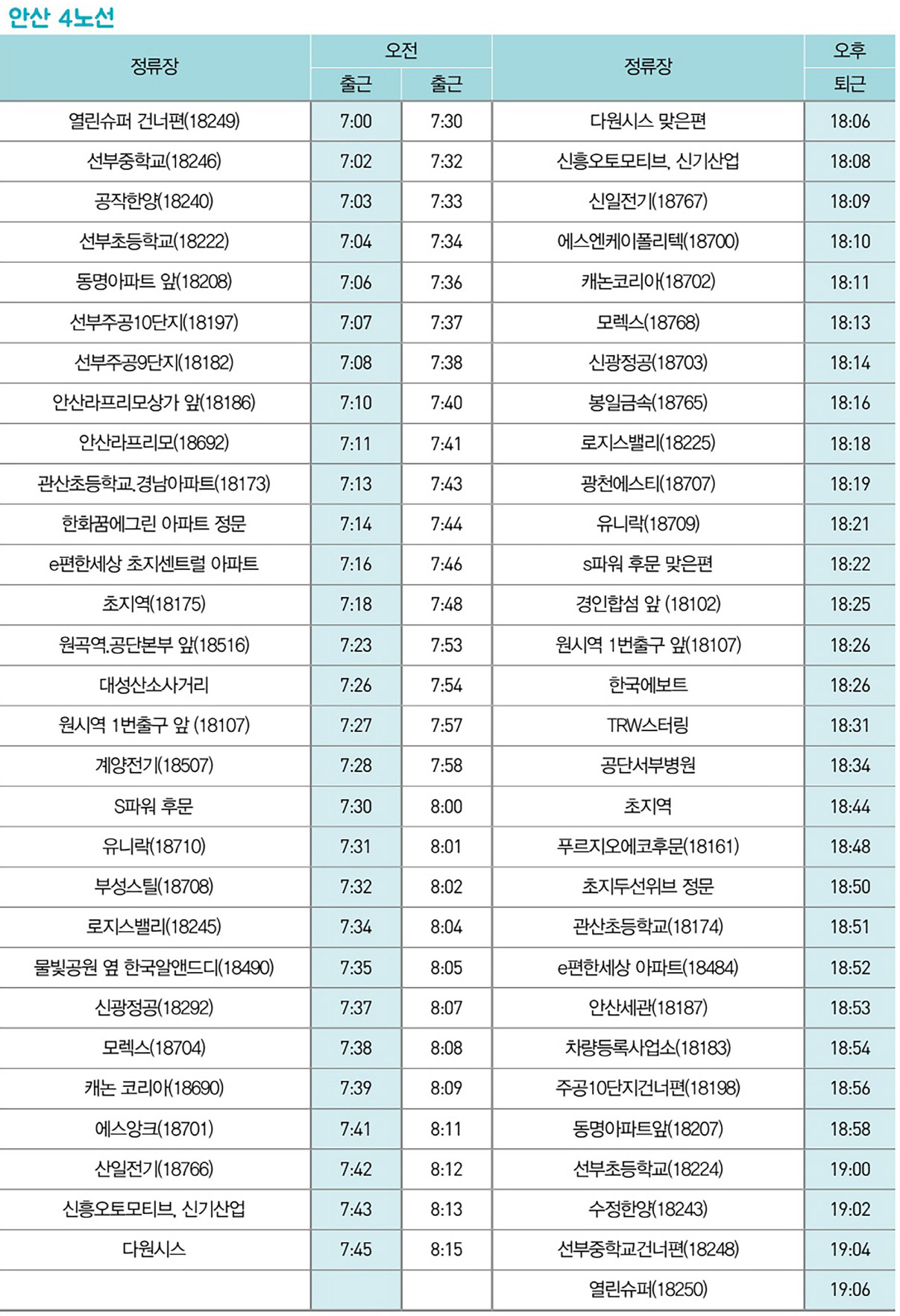 버스운영업체 연락처는 안산 그린코리아관광 (전화번호 031-403-9510), 시흥 월드평화관광 (031-431-2255)