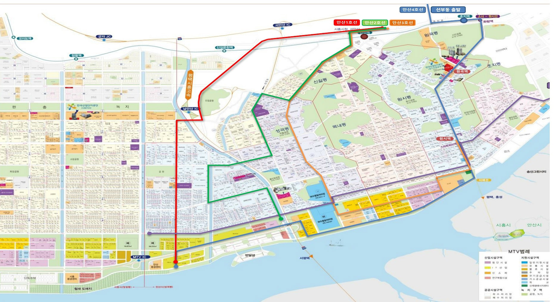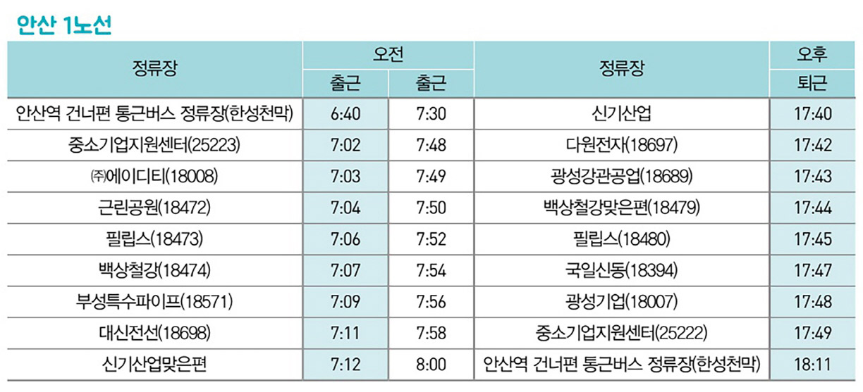 통근버스는 안산 스마트허브 구석구석과 상록수역(4호선), 안산역(4호선·수인선), 초지역(4호선·수인선·서해선), 원시역·원곡역(서해선) 등 관내 주요 전철역을 잇는 5개 노선(출근 9회·퇴근 8회)으로 운영됩니다.
