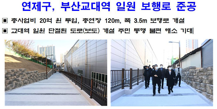 이성문 연제구청장은 “이번 보행로 개설을 통하여 구민들이 보다 편리하고 안전하게 통행할 수 있는 보행환경이 조성되었고, 지하철 및 철도 역사로의 접근성도 향상되었다”며 “앞으로도 구민 불편을 해소하고 살기좋은 연제구 조성을 위해 최선을 다하겠다”고 말했습니다.