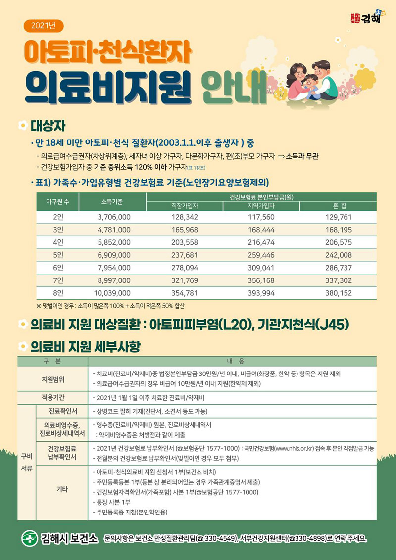 대상은 관내 만 18세 미만(2003년 1월 1일 이후 출생자) 아토피 피부염(L20), 기관지천식(J45) 환자 중 의료급여 수급권자, 세자녀 이상 가구자, 다문화가구자, 편(조)부모 가구자, 기준 중위소득 120퍼센트(%) 이하 가구자(4인 가족 기준 건강보험료 : 직장가입자 203,558원, 지역가입자 216,474원)입니다.