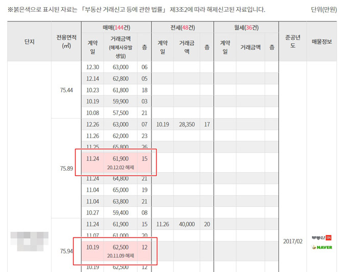 이는 ‘부동산 거래신고 등에 관한 법률’ 개정에 따라 높은 가격에 허위 계약신고 후 취소하는 등의 부동산 거래시장 교란행위 방지를 위해 기존 거래신고정보와 해제이력을 공개하는 것으로, 정확한 부동산 정보제공 및 실거래 가격 동향 파악에 도움이 될 전망입니다.