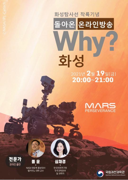 국립과천과학관(관장 이정모)은 2021년도 새 학년 진급을 준비하며 방학을 보내고 있는 청소년들을 위해 과학토크 온라인 방송 ‘돌아온 Why? 화성’을 2월 19일 오후 8시에 진행합니다.
