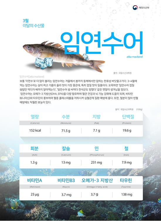 2021년 3월, 해양수산부에서 이 달의 수산물로 선정한 ‘임연수어’는 ‘이면수’라고도 불리며, 겨울에서 봄까지 동해에서만 잡히는 한류성 바닷물고기입니다.