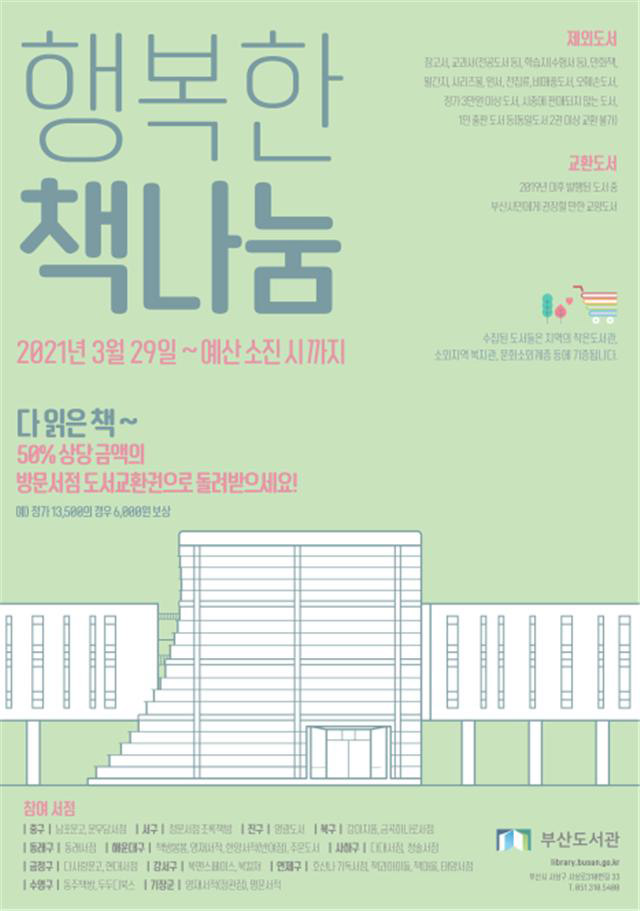 부산시(시장권한대행 이병진) 부산도서관은 오는 3월 29일부터 지역서점 활성활를 위한 ‘2021년 행복한 책나눔’ 사업을 추진한다고 밝혔습니다.