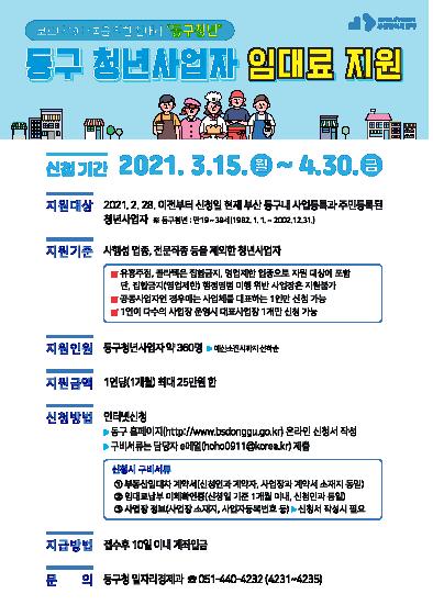 부산 동구(구청장 최형욱)는 코로나19바이러스 유행 장기화로 어려움을 겪고 있는 청년사업자들의 생활안정과 사기진작을 위해 ‘동구 청년사업자 임대료 지원사업’을 작년에 이어 올해에도 추진한다고 밝혔습니다.