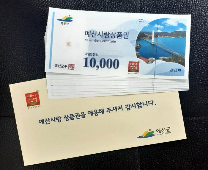 종이형 상품권은 본인 신분증 및 본인 휴대폰을 지참하고 NH농협은행 예산군지부 외 30개 판매대행점에 방문해 5천 원권과 1만 원권 등 두 종류를 살 수 있으며,