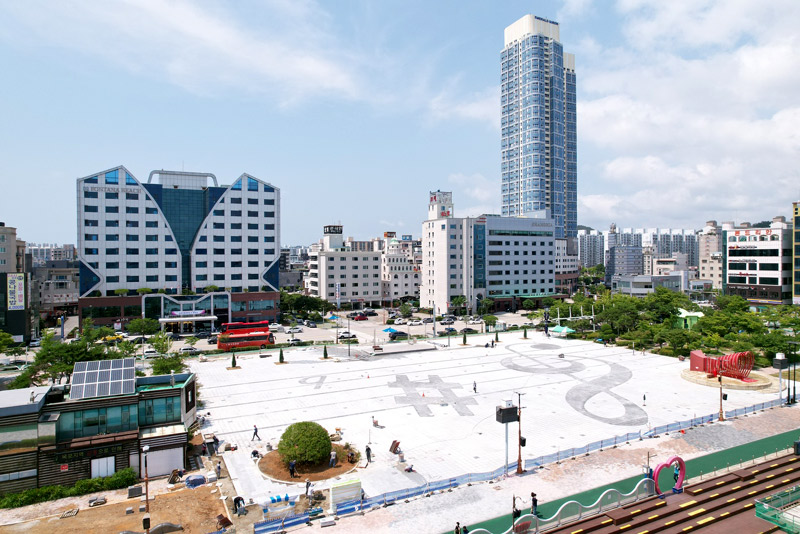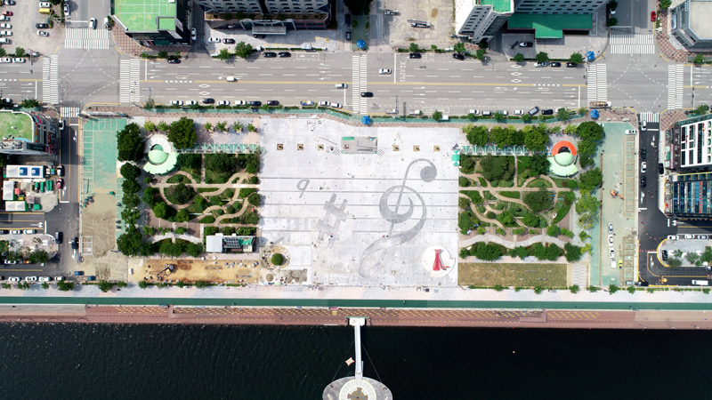 이와 함께 해변도로를 없애 해변 방향으로 중앙광장을 확장하고, 러브게이트를 좌측으로 이동시켜 개방감을 확보했다. 바닥에는 춤추는 바다분수 이미지를 고려하여 높은음자리 등 음표 도안을 그려넣었습니다.