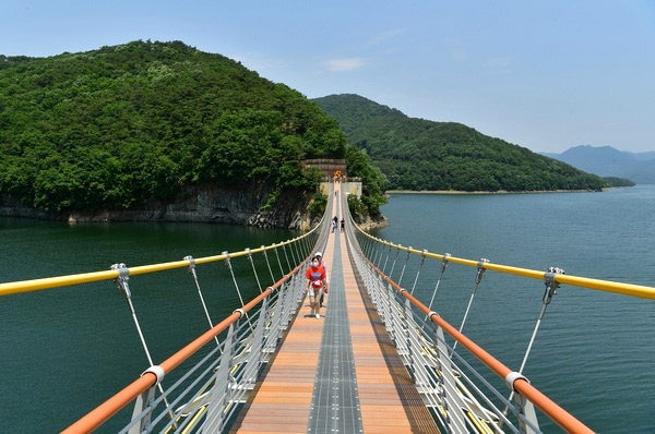 호수의 정경을 바라보며 수변길을 따라 20분쯤 걸으면 옐로우 출렁다리에 도착합니다.