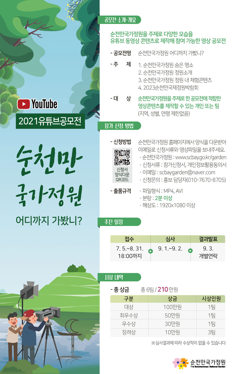순천시(시장 허석)는 2021년 8월 31일까지 ‘순천만국가정원 어디까지 가봤니?’라는 제목의 유튜브 공모전을 개최합니다.