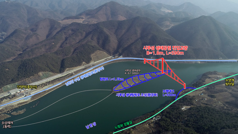 군은 이번 사업을 통해 단양역부터 시루섬을 거쳐 단양강 건너편까지 수변 생태탐방로를 연결하는 680미터(m) 현수교를 건설할 계획입니다.