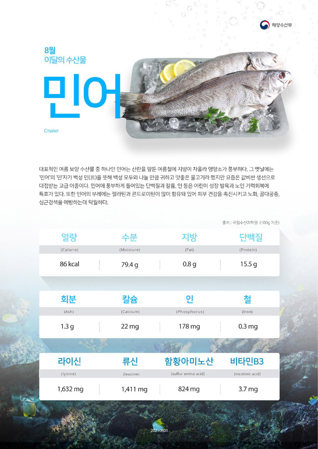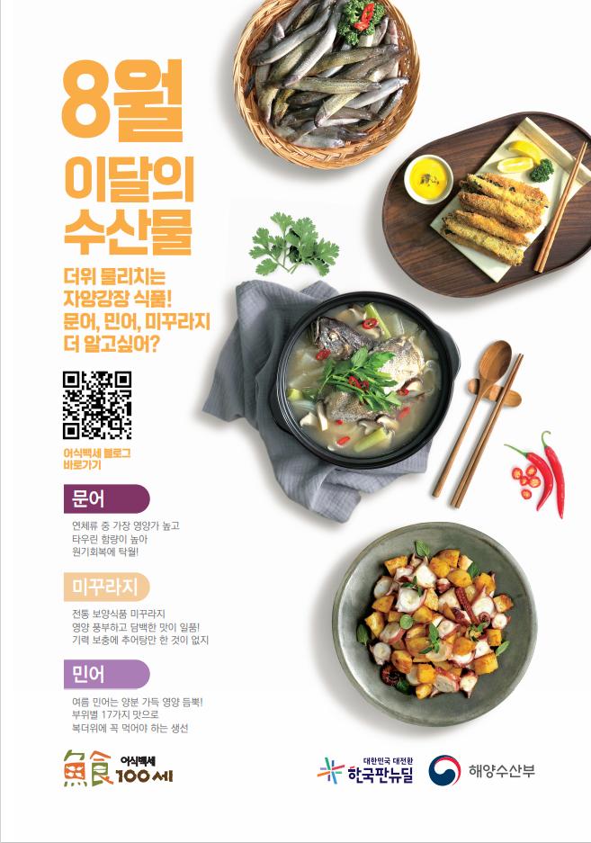 해양수산부(장관 문성혁)는 2021 8월 이달의 수산물로 무더위를 이겨낼 건강 보양식인 민어, 문어, 미꾸라지를 선정하였습니다.