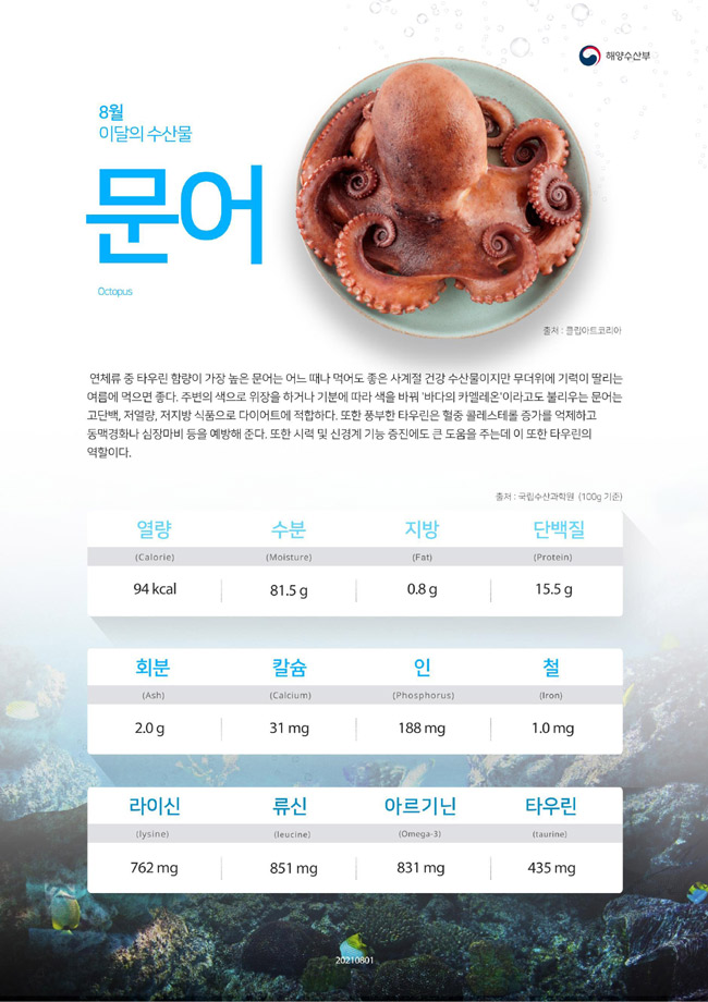 주변의 색으로 위장을 하거나 기분에 따라 색을 바꿔 '바다의 카멜레온'이라 불리는 문어는 고단백, 저지방, 저열량 식품으로 다이어트에 적합하며, 타우린이 풍부하여 혈중 콜레스테롤 증가를 억제하여 동맥경화와 같은 심혈관계 질환을 예방하고, 시력 유지와 신경계 기능 증진에도 도움을 줍니다.