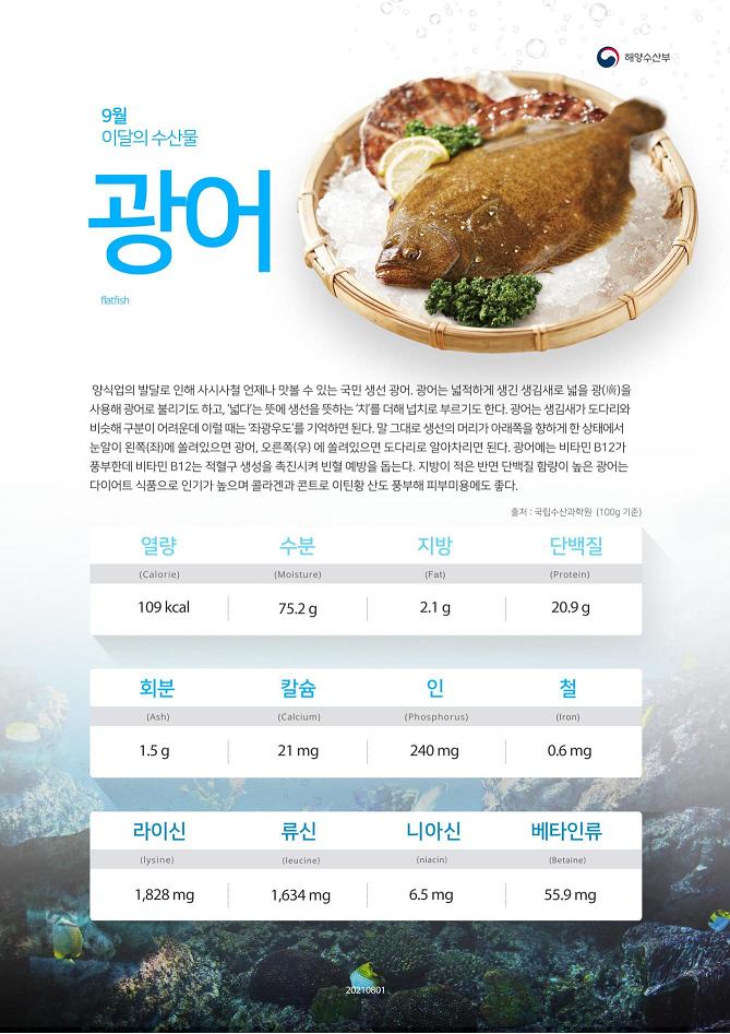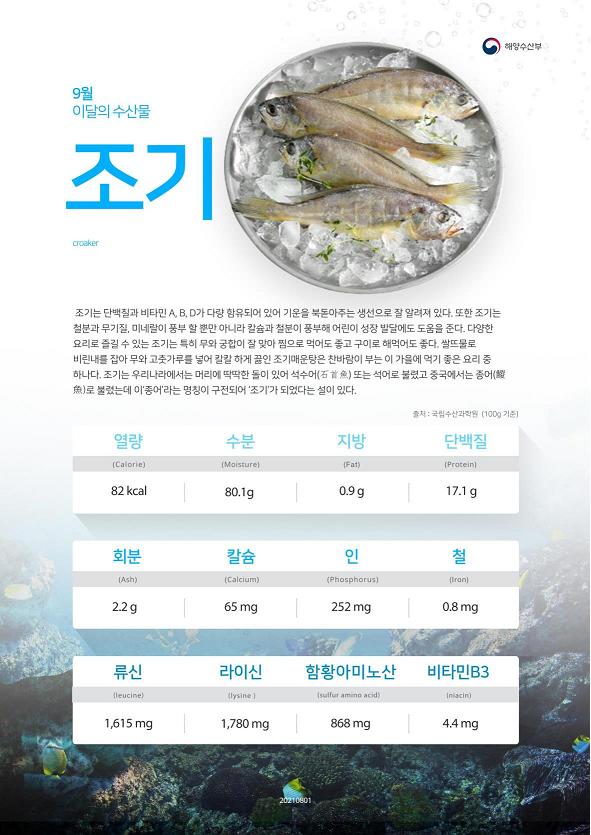 해양수산부(장관 문성혁)는 2021년 9월, 이달의 수산물로 조기와 광어를 선정하였습니다.