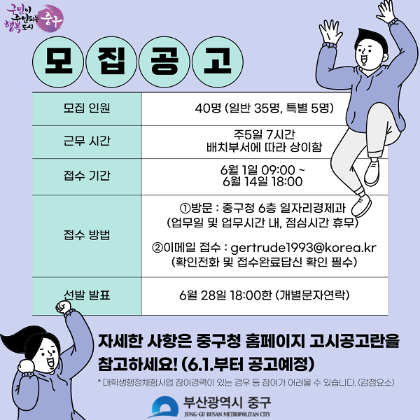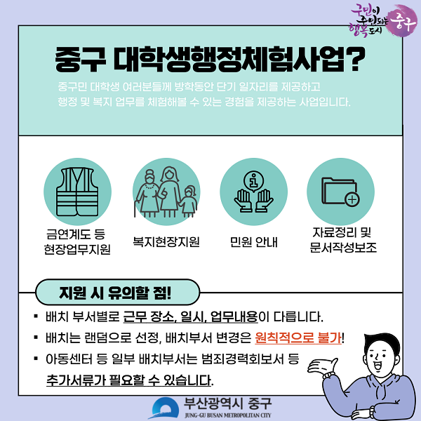 부산시 중구청에서는 2023년 여름방학을 맞이하여 아래와 같이 대학생 행정체험(아르바이트) 참가자를 모집합니다.