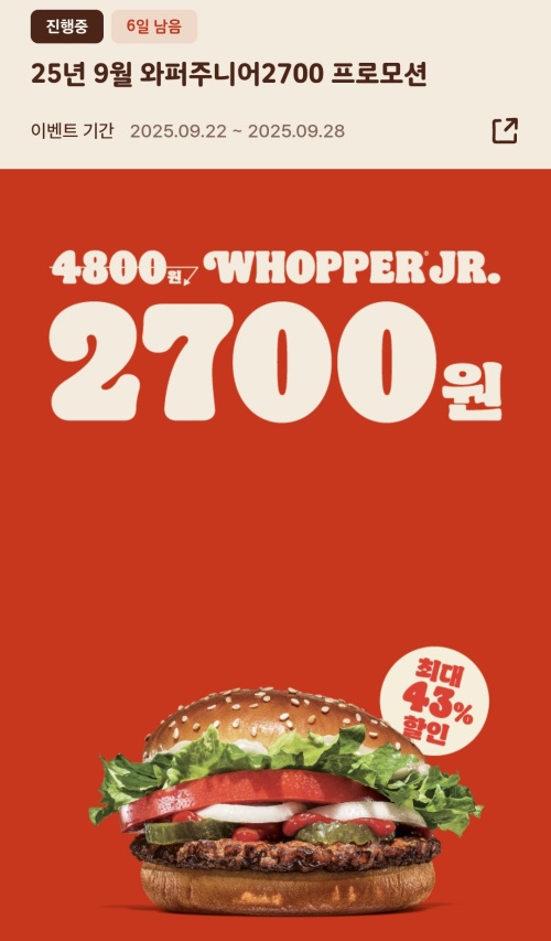 | 버거킹 2025년 9월 와퍼주니어 할인행사 식사 후기 (0) | 2025.09.26 |