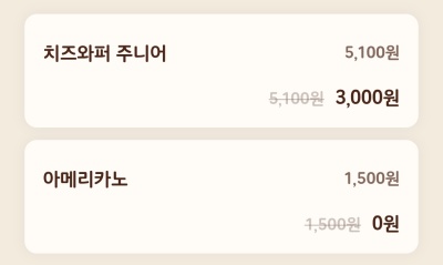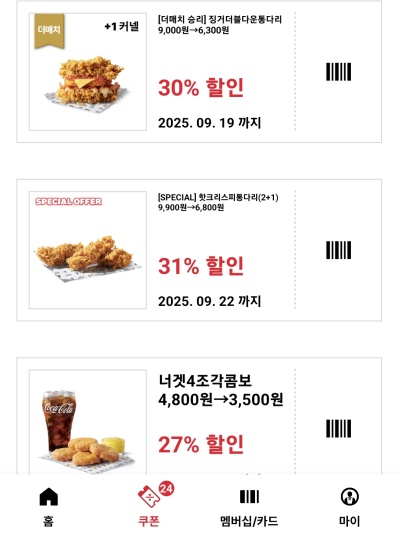 케이에프씨에서 앱회원에게 제공한 '할인권(쿠폰)' 두 가지를 함께 사용했습니다.