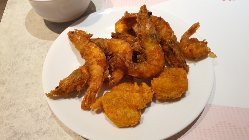접시에 담아와서 껍질을 까 보니, 기존 새우튀김보다 속살 양이 4~5배는 되는 것 같았습니다.